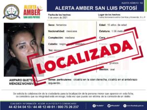 SLP. – La Fiscalía General del Estado de San Luis Potosí (FGESLP), informa que la adolescente Amparo Quetzaly Méndez Monsiváis de 15 años de edad, quien contaba con una Alerta Amber, ya fue localizada sana y salva.