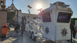 Para reforzar más la seguridad pública en la zona centro de Rioverde, esta mañana el Alcalde Arnulfo Urbiola Román, supervisó la instalación de la Torre de Vigilancia Especial en la plaza Fundadores frente a la parroquia de Santa Catarina de Alejandría.