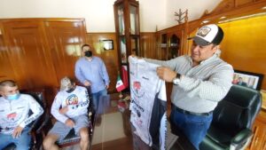 De forma especial, le dieron un Jerseys al presidente Arnulfo Urbiola quien inmediatamente se lo puso y posaron para la foto del recuerdo.