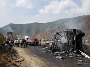 Las primeras versiones indican que el conductor del autobús perdió el control al quedarse sin frenos se impactó contra un trailer cuando bajaba la zona de las Cumbres de Maltrata. La unidad que transportaba pasajeros se volcó luego del choque, algunos lesionados alcanzaron a salir y se incendió el autobús.