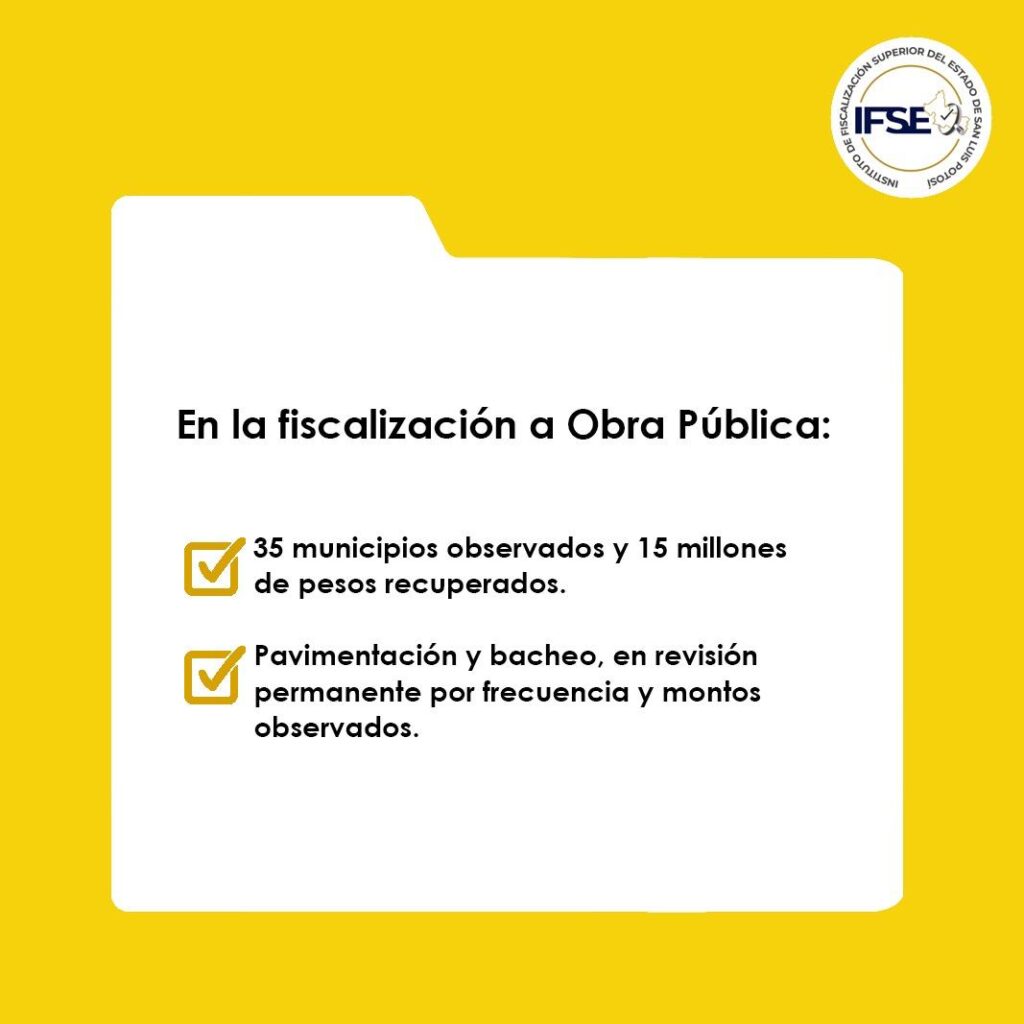 San Luis Potosí, S.L.P. — En el más reciente ejercicio de fiscalización a las Cuentas Públicas del ejercicio anterior, el Instituto de Fiscalización Superior del Estado (IFSE) informó que 35 municipios fueron observados por irregularidades en la ejecución de obras públicas, lográndose la recuperación de 15 millones de pesos provenientes de proveedores y contratistas que incumplieron con especificaciones técnicas.