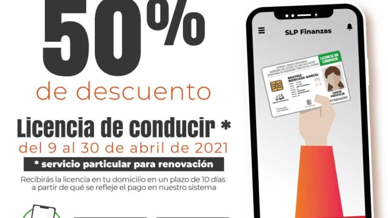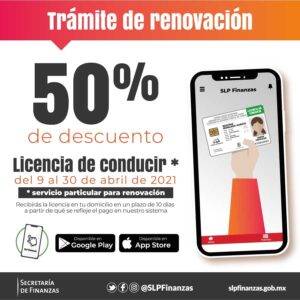 A través de la aplicación móvil “SLP Finanzas”, las y los ciudadanos podrán renovar su licencia de conducir con un 50 por ciento de descuento. Al realizar su trámite por esta vía, en un plazo de 10 días, a partir de que se refleje el pago en el sistema, se enviará al domicilio registrado del contribuyente la nueva licencia, que estará impresa con la misma foto y los mismos datos del último registro.