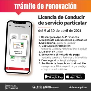 La aplicación móvil “SLP Finanzas” está disponible a través de las plataformas Google Play y App Store y se puede descargar en celulares y tablets. Se registra un correo electrónico; se selecciona el servicio a pagar (en este caso licencia de conducir); se captura el número de licencia y años a renovar; dar click en cotizar; seleccionar método de pago y descargar el recibo oficial de pago.