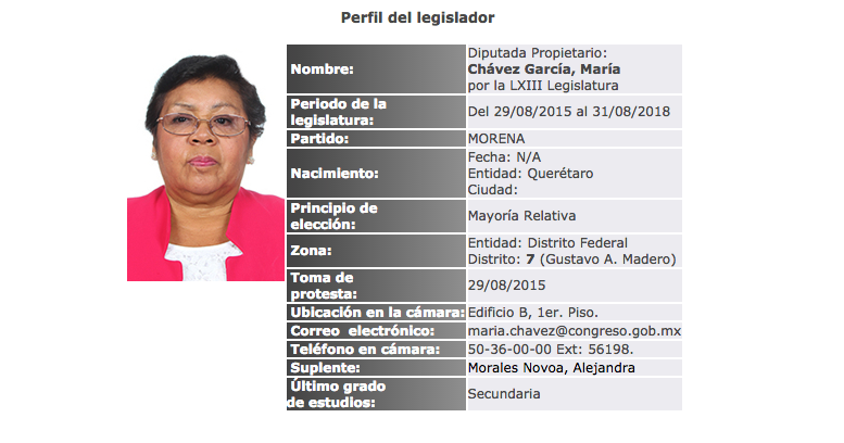 María Chávez García tiene como máximo nivel de estudios la secundaria y como experiencia fue demostradora de lencería y militante de Morena