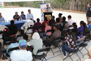 El Alcalde José Ramón Torres García, de manera conjunta con la Presidenta del Sistema Municipal para el Desarrollo Integral de la Familia Rosa Isela Konishi Romero; del Coordinador de Desarrollo Social, Daniel Nieto Caraveo; así como de autoridades ejidales y miembros del Comité de Obra, efectuaron el corte del listón inaugural de la obra y realizaron los primero tiros al aro de basquetbol y a la portería de futbol, durante el acto protocolario efectuado.