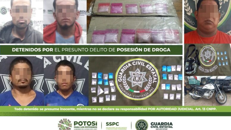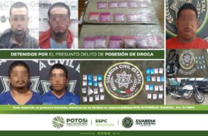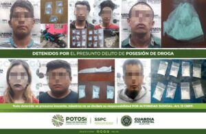 SAN LUIS POTOSÍ- Como resultado de la estrategia integral de seguridad llevaba a cabo para combatir de manera frontal la delincuencia en el Estado, en distintas acciones, Policías de la Guardia Civil Estatal (GCE) detuvieron a 12 personas por presunta posesión de enervantes.