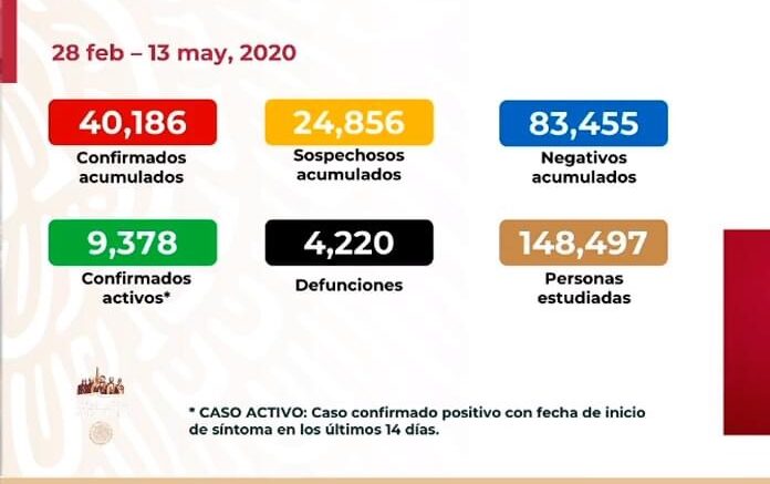 El director general de Epidemilogía de la Secretaría de Salud, José Luis Alomía Zegarra, confirmó que en México hasta este miércoles se tienen registrados 40 mil 186 casos acumulados de COVID-19 y cuatro mil 220 defunciones.