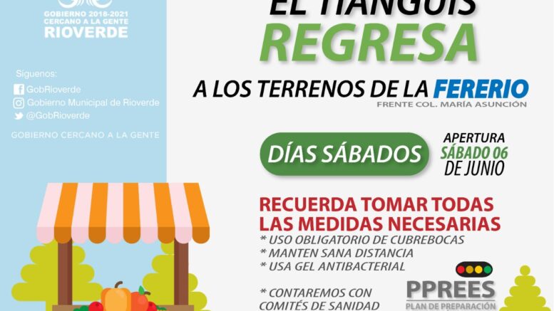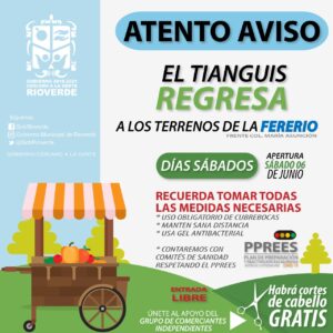 Será el próximo sábado 06 de Junio a partir de las 8:00 de la mañana en las instalaciones de la Feria Regional en el Barrio de los Angeles, frente a la colonia María Asunción, en dónde se reactiven las actividades paulatinas del tianguis con este grupo de personas las cuales son dentro de un aproximado de 400 personas las cuales brindarán los servicios de (comida, zapatos, juguetes) todos ellos con espacios de sana distancia y con las medidas preventivas de sanidad. Los espacios no estarán limitados, solo con un espacio de tres metros entre uno y otro, y no constará de un costo tanto de acceso como de piso, ya que el gobierno municipal estará brindando todas las facilidades para que esto pueda funcionar de la mejor manera.