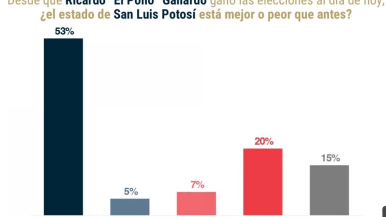 Además, el 65 por ciento de las personas encuestados afirmó que el gobierno de Ricardo Gallardo es menos corrupto que gobiernos anteriores; contra un 13 por ciento que dijo “más corrupto” y a la pregunta si el actual gobierno funciona, 73 por ciento respondió que sí, contra un 15 por ciento que respondió que no.