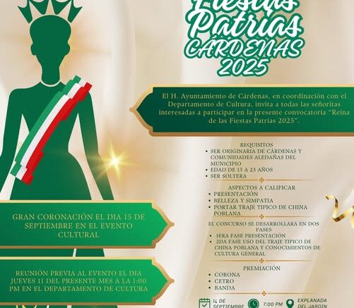 Cárdenas, S.L.P. – El H. Ayuntamiento de Cárdenas, en conjunto con el Departamento de Cultura, ha lanzado la convocatoria oficial para elegir a la Reina de las Fiestas Patrias 2025. Esta iniciativa busca destacar el talento y la belleza de las jóvenes cardenenses, dándoles la oportunidad de representar a su municipio durante las celebraciones de septiembre.