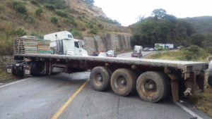 Un tráiler color blanco, con remolque tipo plataforma, se descuadró y quedó atravesado sobre la carretera, por lo que se vio interrumpido el trafico en la vía  por unas horas, hasta que llegó una grúa y movió la unidad.