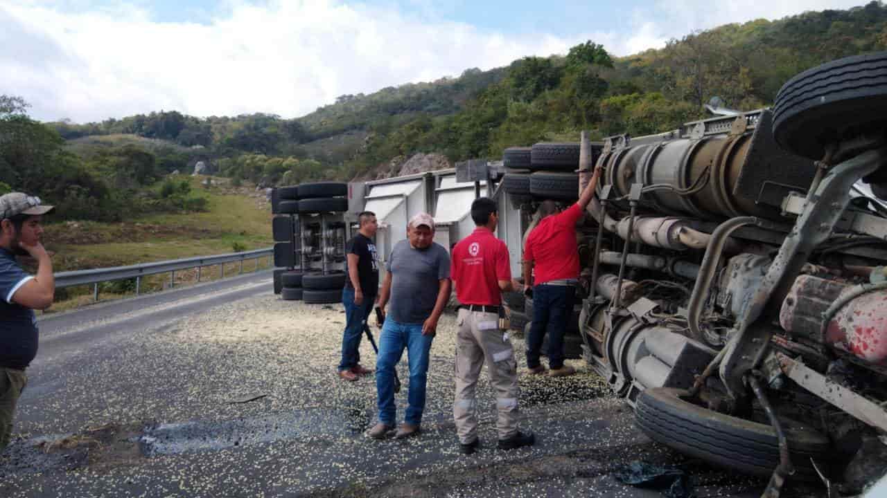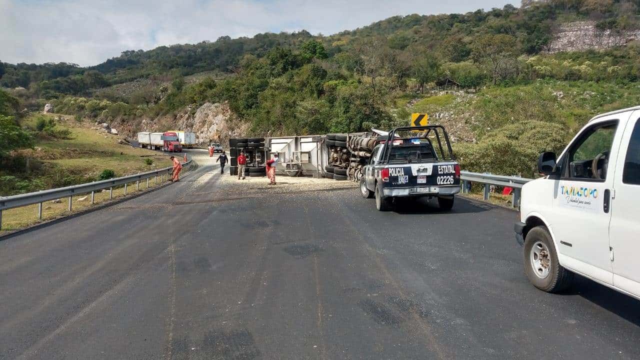 El chófer de un tráiler invadió carril, chocó contra un vehículo compacto y volcó sobre la autopista Valles-Rayón. La unidad afectada cayó a un desnivel y su conductor falleció.