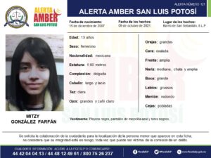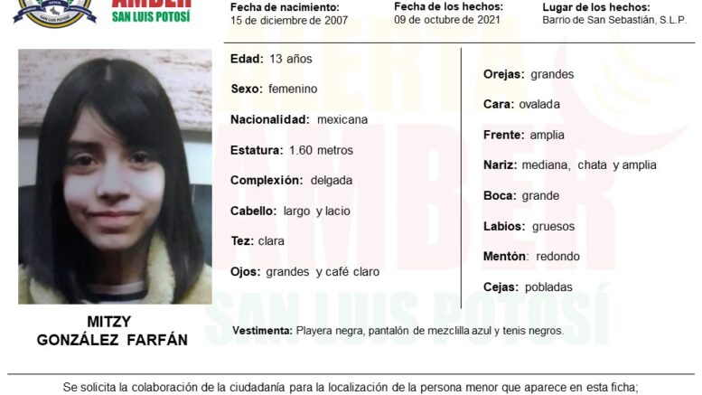 SLP. – La Fiscalía General del Estado de San Luis Potosí (FGESLP), activó una Alerta Amber para la localización de una menor de 13 años de edad, de nombre Mitzy González Farfán, quien fue vista por última vez en el Barrio de San Sebastián en la ciudad Capital.