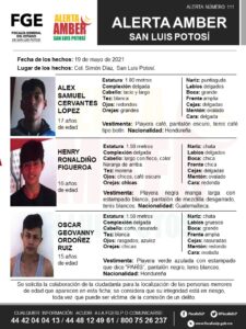 SLP. – La Fiscalía General del Estado de San Luis Potosí (FGESLP), activó una Alerta Amber para la localización de seis menores, tres de ellos de 16 años de edad, dos de 15 años de edad y uno más de 17 de años de nombres Edras Asael Castellanos Rugama, Oscar Adonis Benítez Godoy, Yobani Sebastián Esturbo Bernal Cobo, Alex Samuel Caravantes López, Henry Ronaldiño Figueroa, Oscar Geovanny Ordoñez Ruiz; quienes se sustrajeron de un centro de asistencia social en la colonia Simón Díaz en la ciudad Capital.