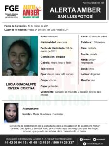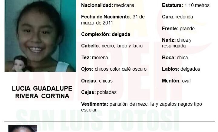 SLP. – La Fiscalía General del Estado de San Luis Potosí (FGESLP), activó una Alerta Amber, para la localización de una menor de 10 años de edad, de nombre Lucía Guadalupe Rivera Cortina, la cual fue vista por última vez en la colonia Prados Segunda Sección en la ciudad Capital.