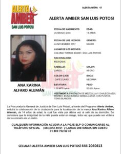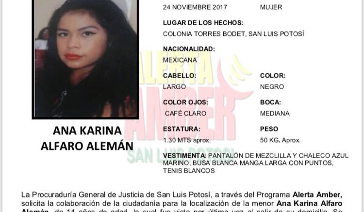 SLP.- La Procuraduría General de Justicia de San Luis Potosí (PGJSLP), activó la Alerta Amber para localizar a la menor Ana Karina Alfaro Alemán de 14 años de edad, quien fue vista por última vez al salir de su domicilio en la colonia Torres Bodet de la capital potosina.