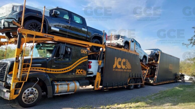 San Luis Potosí, S.L.P.- Gracias a la respuesta inmediata de un reporte que alertaba sobre el robo de un trailer nodriza con vehículos a bordo en la carretera Matehuala, agentes de la Guardia Civil Estatal (GCE) localizaron en menos de 24 horas dicha unidad la cual transportaba 4 automotores los cuales fueron asegurados.