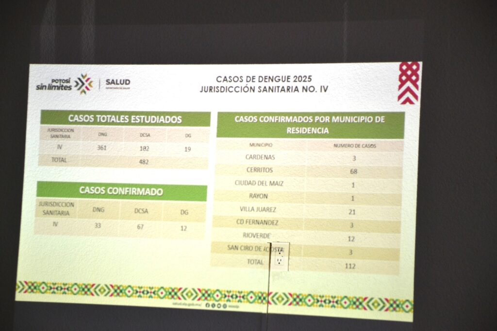 RIOVERDE, S.L.P.— La Secretaría de Salud, a través de la Jurisdicción Sanitaria 04, ha encendido las alertas por el incremento de casos de dengue en la Zona Media de San Luis Potosí, al confirmar un total de 112 casos positivos en la región durante su más reciente reunión de evaluación.