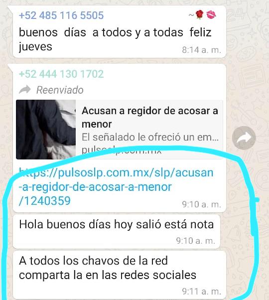 En un grupo de whatsapp, se puede apreciar como el edil, poseedor de un número con terminación 1702, hace un llamado a todos los integrantes del ayuntamiento a difundir en redes sociales una nota publicada en un medio digital de la Capital donde se insta a todos los directores de área para que den difusión y traten de ensuciar el nombre del más fuerte aspirante a la presidencia.