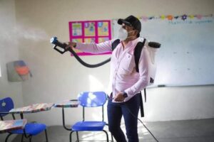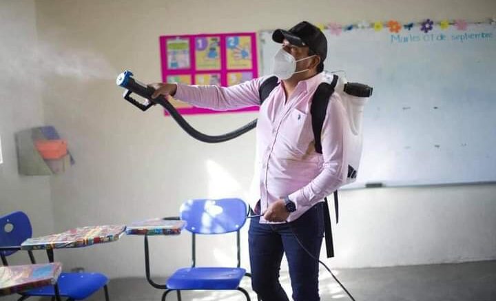 Alcalde Electo de Santa María Del Río pone el ejemplo y fumiga centros escolares