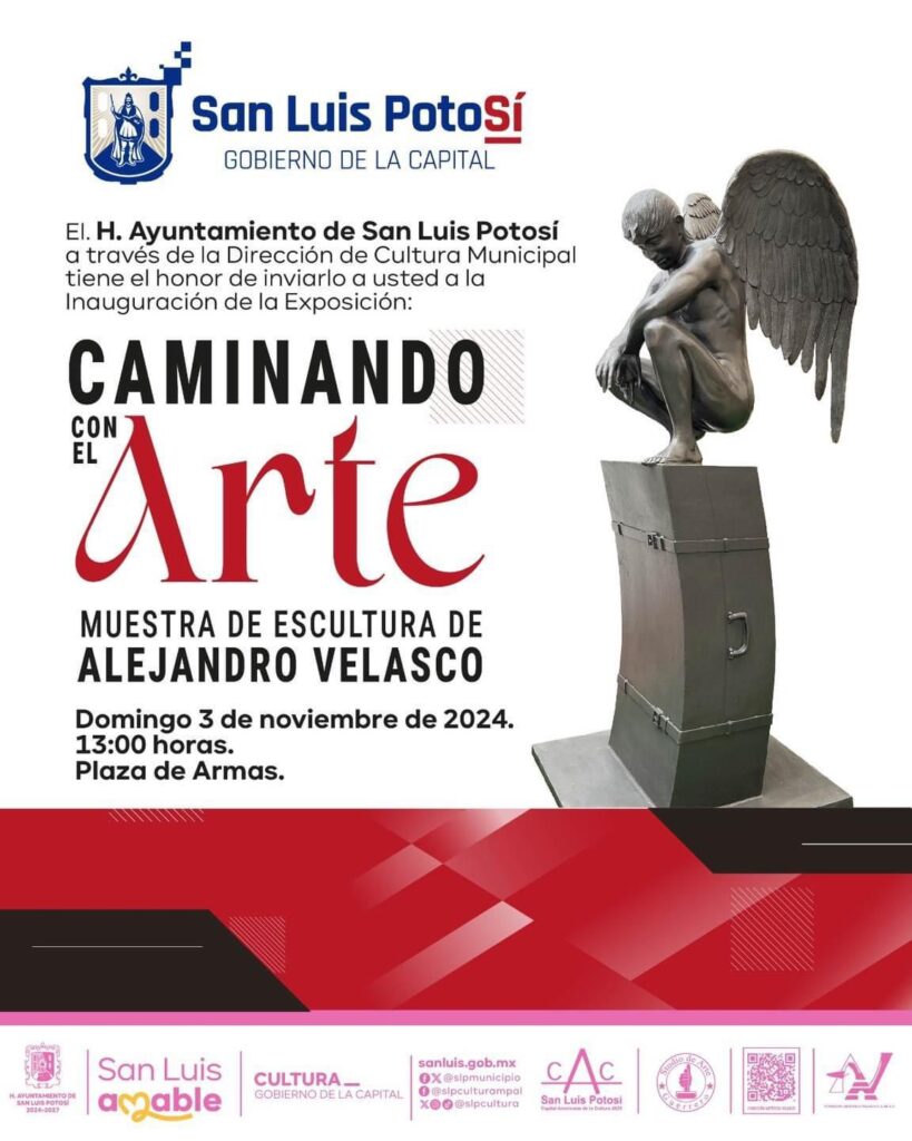 El Gobierno de la Capital y la Dirección de Cultura Municipal, con el invaluable apoyo del Arquitecto y artista plástico Alejandro Velasco Mancera, invitan a la inauguración de la exposición de escultura monumental Caminando con el arte, un evento que promete envolver a los asistentes en un fascinante universo surrealista, donde lo tradicional se fusiona con lo contemporáneo. La cita será el próximo 3 de noviembre de 2024 a las 13:00 horas, en la Plaza de Armas de la ciudad de San Luis Potosí.