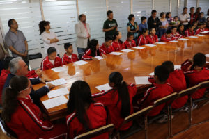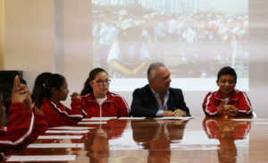 A nombre del Gobernador del Estado, Juan Manuel Carreras López, el Secretario de Educación, Joel Ramírez Díaz, felicitó por su esfuerzo y dedicación a la delegación potosina integrada por 33 alumnos de sexto grado de educación primaria que obtuvieron los mejores promedios en San Luis Potosí en la Olimpiada del Conocimiento Infantil 2018, con quienes se reunió en las instalaciones de SEGE, a donde arribaron la tarde de este viernes luego de su visita al Presidente de la República, Enrique Peña Nieto, como parte de la denominada “Convivencia Cultural” en la Ciudad de México.