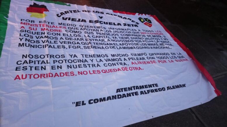 Las lonas que fueron colocadas en diferentes puntos principalmente puentes peatonales y plazas principales de los municipios de  Villa de Arista y Moctezuma , en el circuito interior, en el puente peatonal frente a Citadela de soledad encarretera 57 frente y la de Rioverde