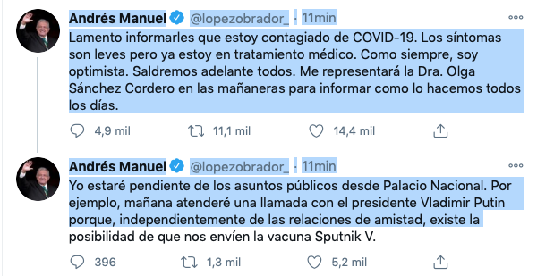 “Lamento informarles que estoy contagiado de COVID-19. Los síntomas son leves pero ya estoy en tratamiento médico. Como siempre, soy optimista. Saldremos adelante todos”, comunicó el mandatario a través de su cuenta de Twitter.