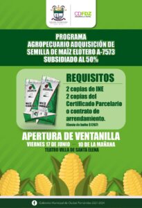 El gobierno municipal a través de la dirección de Desarrollo Rural anuncia la apertura de ventanilla del programa “Agropecuario Adquisición de Semilla de Maíz Elotero A-7573 subsidiado al 50%” y a la vez convoca a todos los productores del campo que acudan este viernes 17 de junio a las 10 de la mañana al teatro Villas de Santa Elena.
