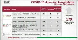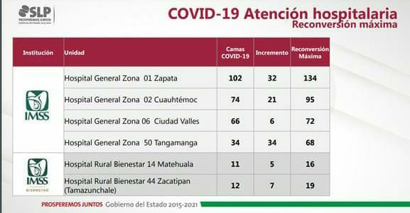 Lo anterior lo dio a conocer Miguel Lutzow Steiner, vocero del Comité y titular de la Secretaría de Salud, quien informó que en total se trata de incrementar 179 nuevas camas para: Hospital General del ISSSTE; Clínica Hospital ISSSTE Tamazunchale; Unidad Centinela Fenapo; Hospital Niño y la Mujer; Hospital de Soledad; Hospital Central; y en los hospitales del IMSS de Nicolás Zapata, Cuauhtémoc, número 50, número 6 de Ciudad Valles, así como Hospitales Rurales de Matehuala y de Tamazunchale.