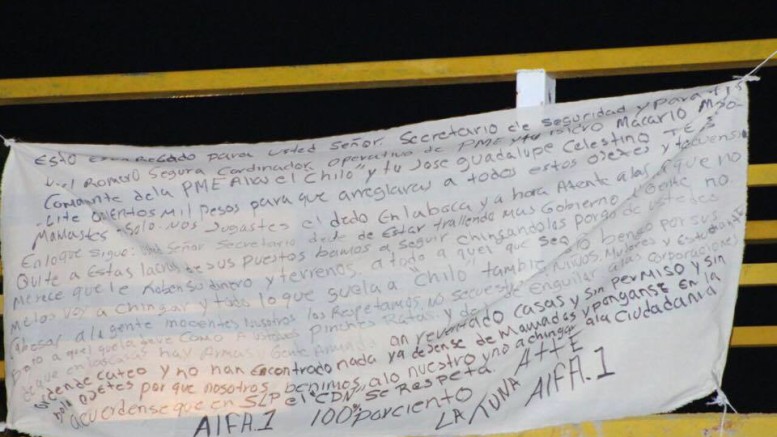 En las mantas firmadas presuntamente por el cartel del noreste, asegura que los mandos policiales de la ministerial del estado acordaron cierta cantidad de dinero, mismo que no cumplieron, por lo que se les estará presionando para que dejen de extorsionar a la ciudadanía.
