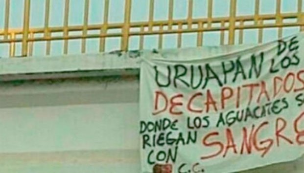 Colgadas en un paso peatonal, justo enfrente de la planta de Pemex en la región, la mantas decían “Uruapan de los decapitados, donde los aguacates se riegan con sangre”, adempás de “Bienvenidos a Uruapan, tierra de la impunidad”.