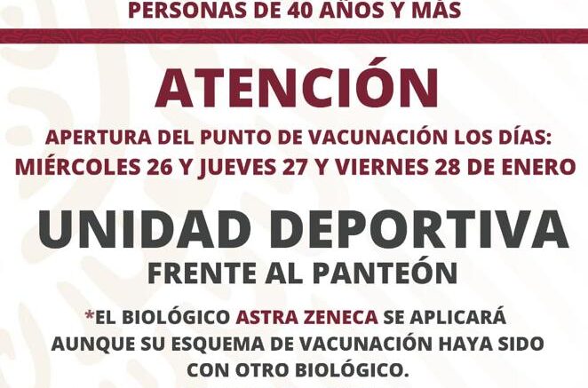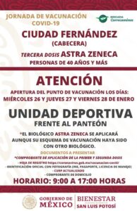 La dirección de Salud anuncia la aplicación de la tercera dosis de la vacuna Astra Zeneca contra Covid-19 para personas de 40 años y más, los días 26, 27 y 28 de enero en la Unidad Deportiva de Ciudad Fernández.