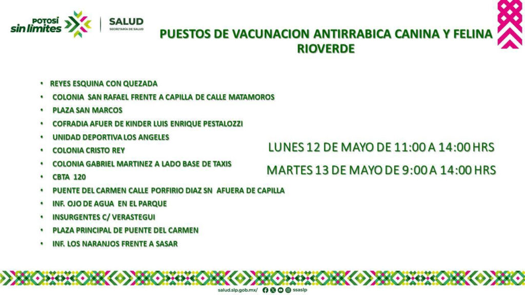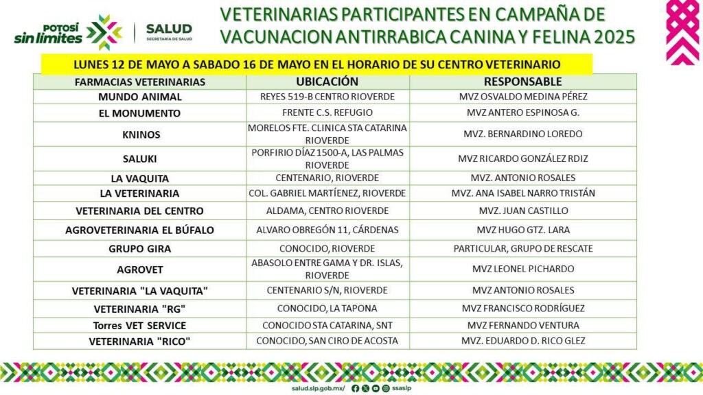 La vacunación será gratuita y se llevará a cabo en diversos puntos estratégicos de los municipios de Ciudad Fernández, Santa Catarina, San Ciro de Acosta, y Cárdenas, además de contar con el respaldo de clínicas veterinarias privadas.