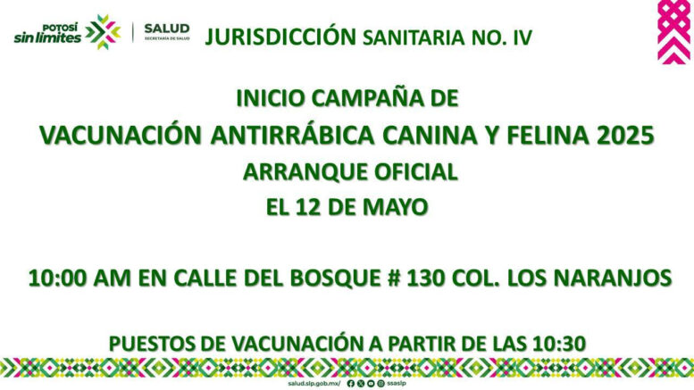 CIUDAD FERNÁNDEZ, S.L.P. — Este lunes 12 de mayo dará inicio la Campaña de Vacunación Antirrábica Canina y Felina 2025, con el arranque oficial en la Jurisdicción Sanitaria, ubicada en la calle del Bosque, colonia Los Naranjos. Esta jornada busca proteger a las mascotas y prevenir casos de rabia en la región.