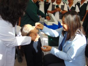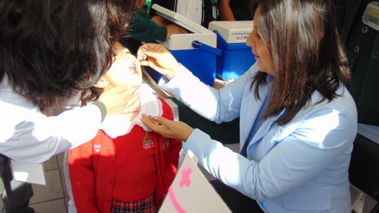 La Presidenta del Sistema Municipal para el Desarrollo Integral de la Familia, Rosa Isela Konishi Romero, fue quien aplicó las primeras dosis de antibiótico a niñas y niños que asistieron a este evento, en una semana de vacunación que es coordinada por el Instituto Municipal del Seguro Social.