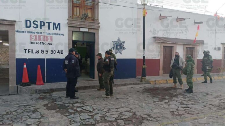 Mexquitic de Carmona, S.L.P.- Agentes de la Guardia Civil Estatal (GCE) detuvieron a cuatro personas por los presuntos delitos de usurpación de funciones, uso indebido de condecoraciones exclusivas para personal policial y lo que resulte, luego de un pase de revista a elementos de la corporación municipal, en colaboración con el Ejército Mexicano.