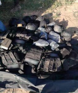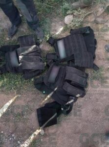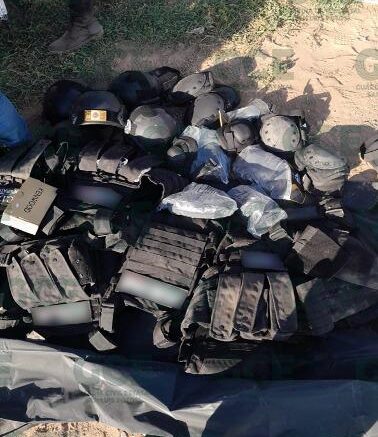 Una vez que se llevó a cabo una inspección en el interior del vehículo, los miembros de la GCE descubrieron un considerable arsenal, entre otros elementos. Las autoridades periciales fueron convocadas para documentar la escena y llevar a cabo las investigaciones correspondientes. Entre los elementos incautados se encontraban cinco armas de fuego tipo fusil de asalto, 45 cargadores de distintos calibres, cinco cascos tácticos, siete chalecos balísticos con insignias que apuntan a una posible pertenencia a una célula delictiva, cada uno de estos chalecos contenía dos placas balísticas. Además, también se encontraron cinco armas de fuego cortas, cinco pares de rodilleras, así como herramientas como un marro, un pico y una pala.