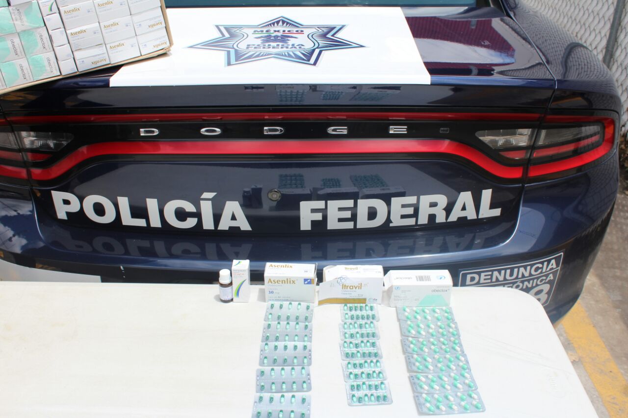 Elementos de la Policía Federal pertenecientes a la División de Seguridad Regional al efectuar inspecciones en empresas de paquetería en el Aeropuerto Internacional de San Luis Potosí, aseguraron en dos acciones distintas, 91 cajas con un total de tres mil 20 cápsulas, tabletas y soluciones de fármacos controlados y un arma de fuego corta calibre 40 con dos cargadores.