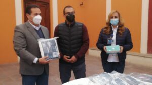 Fue el Alcalde José Ramón Torres García, quien acompañado de la titular de Salud Municipal, Selene Paz Martínez y del Jefe del Departamento de Compras, Cuauhtémoc de los Santos, efectuó la entrega de una cantidad de 500 cubre bocas, 100 overoles Taybk, y 200 pares de cubre zapatos, mismos que fueron recibidos por el Director del Hospital, doctor Alberto Hernán Rodríguez Pesina.