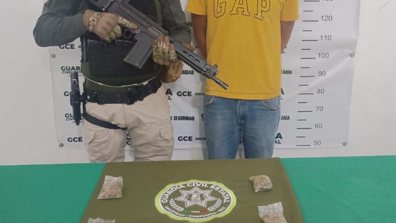Rioverde, S.L.P. – En un operativo de rutina, agentes de seguridad detuvieron a un hombre en posesión de presunta droga en la colonia Puente del Carmen. Al verificar su estatus en el sistema C4, se confirmó que el sujeto contaba con un mandamiento vigente por delitos contra la salud.