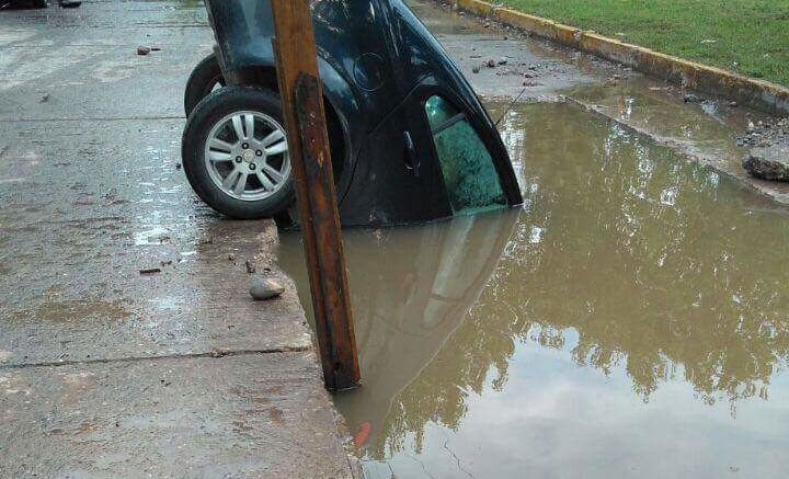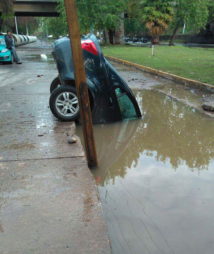 Un conductor que al no respetar la señalética restrictiva en la zona de obras del río Santiago, cayó en una zanja que se encontraba cubierta de agua, esto a la altura de Carlo Magno.