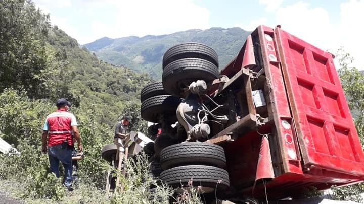 Los hecho sobre la carretera federal 120, a la altura de la comunidad Cuesta de Huazmazontla, un camión de carga evitó su caída a un profundo barranco gracias a una lamina de contención colocadas en la curva