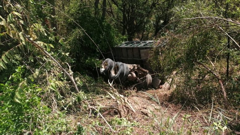 Se informó que un camión de volteo marca International color verde, cargado con arena, se salió del camino y cayó a un desnivel, volcando y chocando contra un árbol, pero su conductor por fortuna no sufrió lesiones.