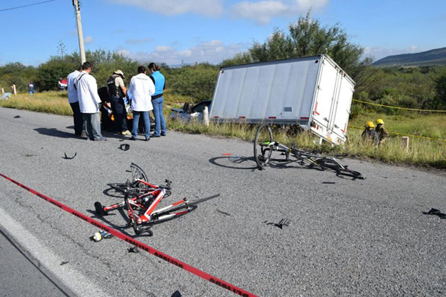 Esta mañana en la carretera a Zacatecas una camioneta que era conducida a alta velocidad embistió a un grupo de ciclistas dejando como saldo un muerto y varios lesionados, entre ellos el abogado José Mario de la Garza Mendizábal y cuatro personas mas quienes practican el ciclismo de ruta en carreteras cercanas a la ciudad.