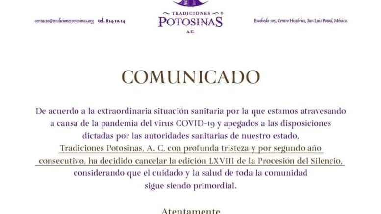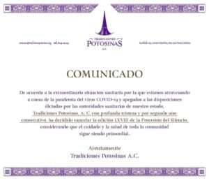 Este día por segundo año consecutivo, Tradiciones Potosinas anunció la cancelación de la Procesión del Silencio.