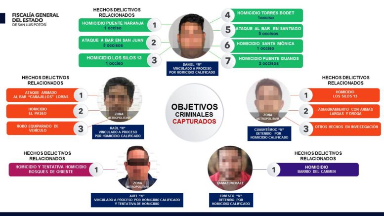 SLP.- La Fiscalía General del Estado de San Luis Potosí, a través de sus elementos investigadores, labores de inteligencia y trabajo de agentes del ministerio público especializado, logró la captura de 4 objetivos criminales buscados por las autoridades, siendo tres de ellos los que presuntamente están relacionados con los últimos ataques, agresiones y homicidios ocurridos en la zona Metropolitana.