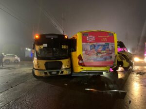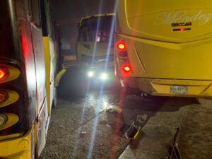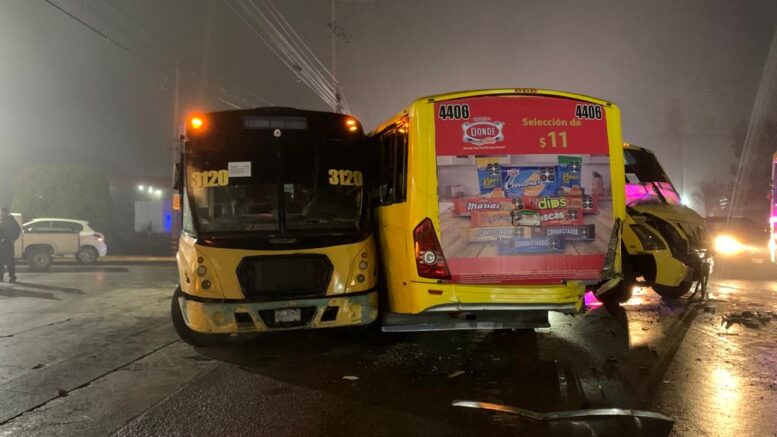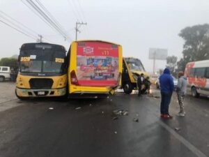 Policía Vial de Soledad de Graciano Sánchez atiende hecho de tránsito donde se involucraron cuatro vehículos en la carretera Matehuala con orientación de oriente a poniente, el choque se dio entre un autobús grande tipo omnibus, fue el responsable del accidente ya que no guardo debidamente su distancia y golpeó a otro autobús por la parte de atrás a otro autobús del mismo tipo haciéndolo girar 360 grados e invadir los carriles contrarios golpeando a otro autobús que a su ves golpeó a otro omnibus