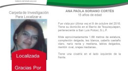 SLP.- La Procuraduría General de Justicia del Estado (PGJE) informó que ya fue localizada la menor de edad, Ana…