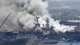 APUna enorme columna de humo se eleva sobre el buque USS Bonhomme Richard en la base naval de San Diego…